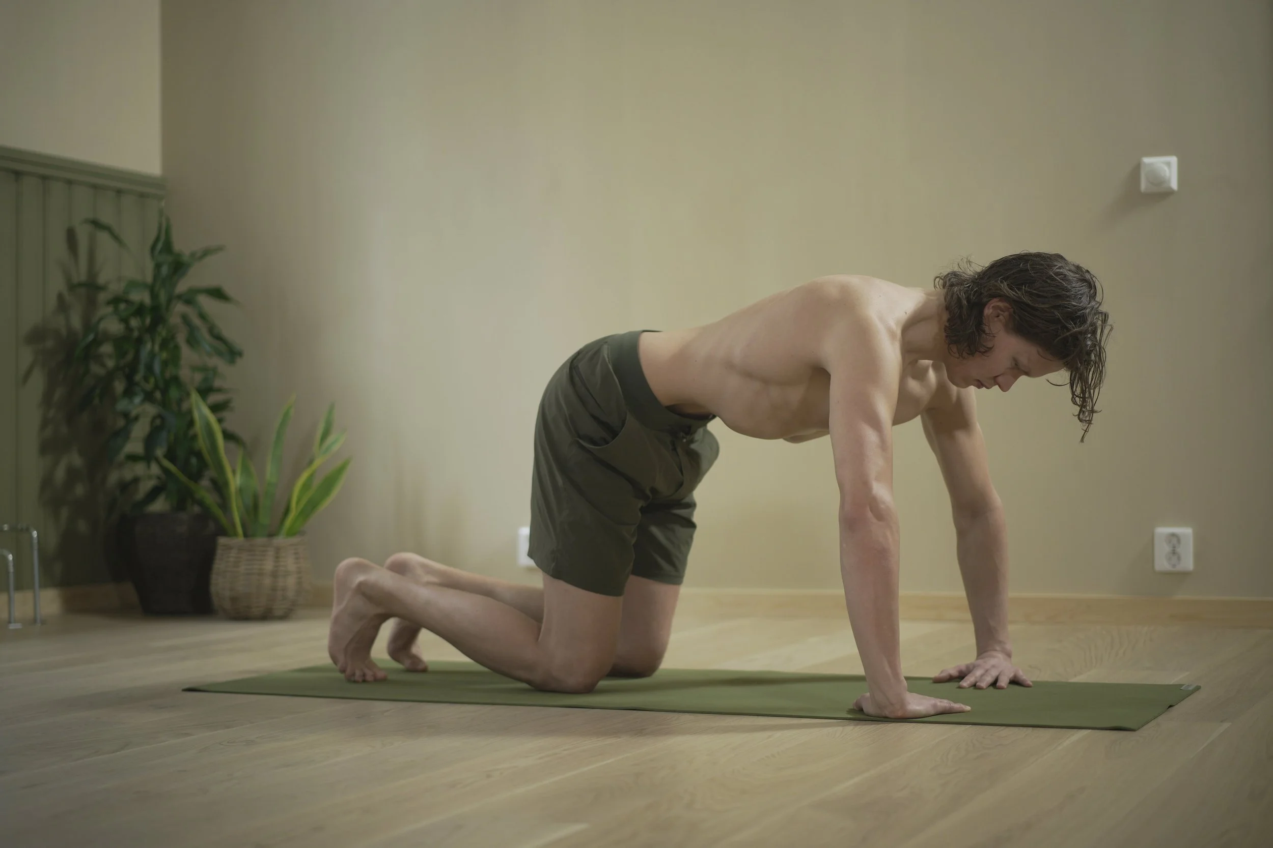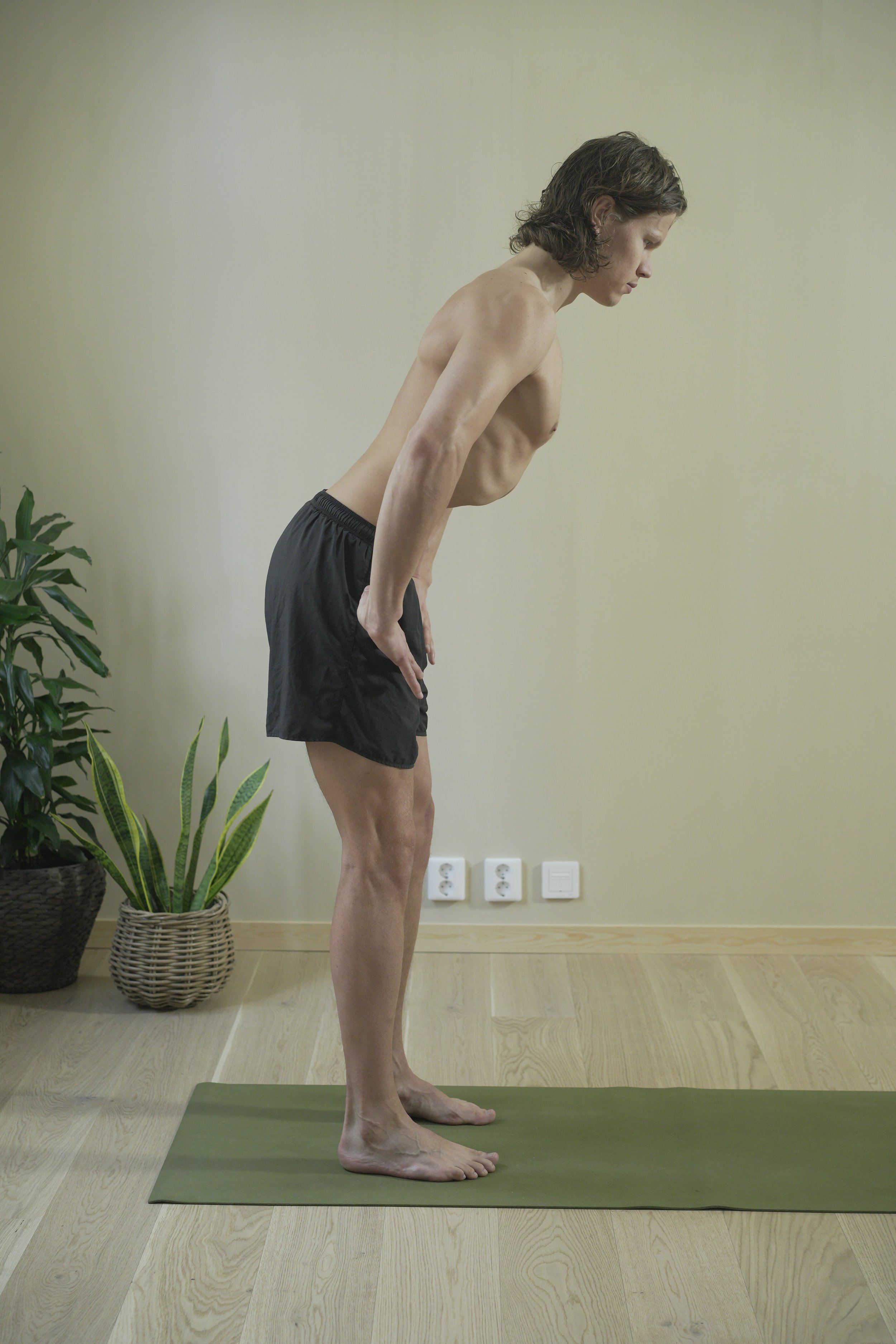 1 fot avstand mellom føtteneLett bøy i knærNøytral kurve i ryggenArmene i ring med hender på hofteneBlikk på skrått nedoverNøytral nakkeVariant 2: Nakke i fleksjon (se mot navel) + armene strukket bakover